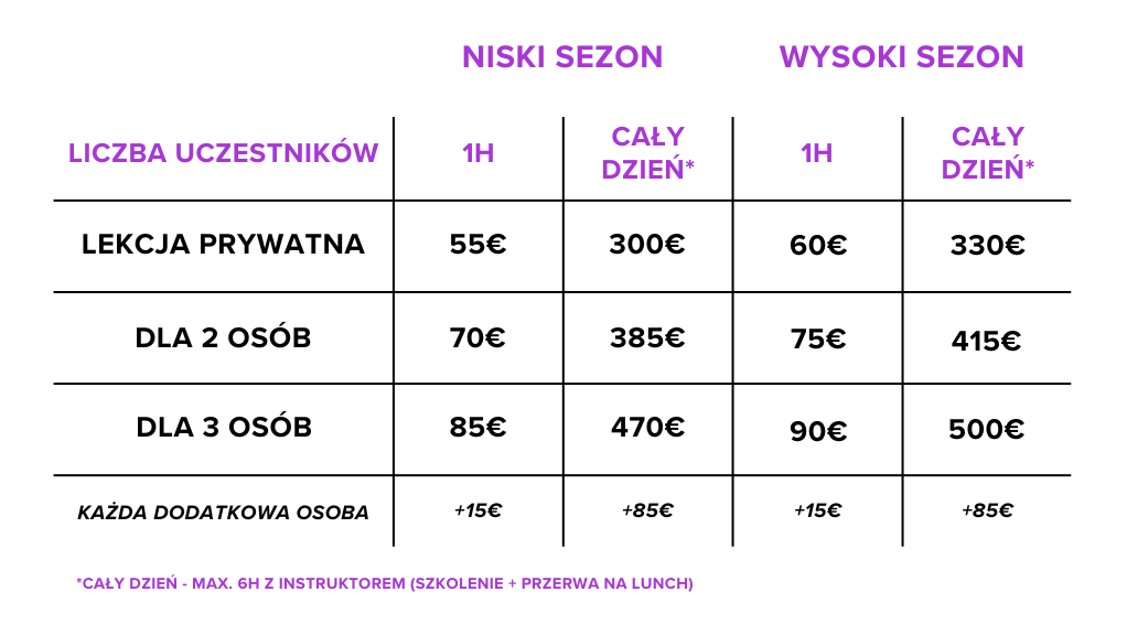 Lekcje są zawsze prywatne. Możesz jeździć sam, z rodziną lub przyjaciółmi – ale nigdy z obcymi osobami.
